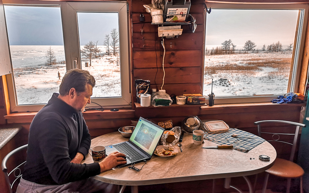 На 3 дня кордон "Анютка" в Байкало - Ленском заповеднике стал для меня теплым приютом. Вечерами в тишине и спокойствии хорошо работается. Поглядывая на Байкал обрабатываю материал собранный за день, пишу статьи, размышляю.