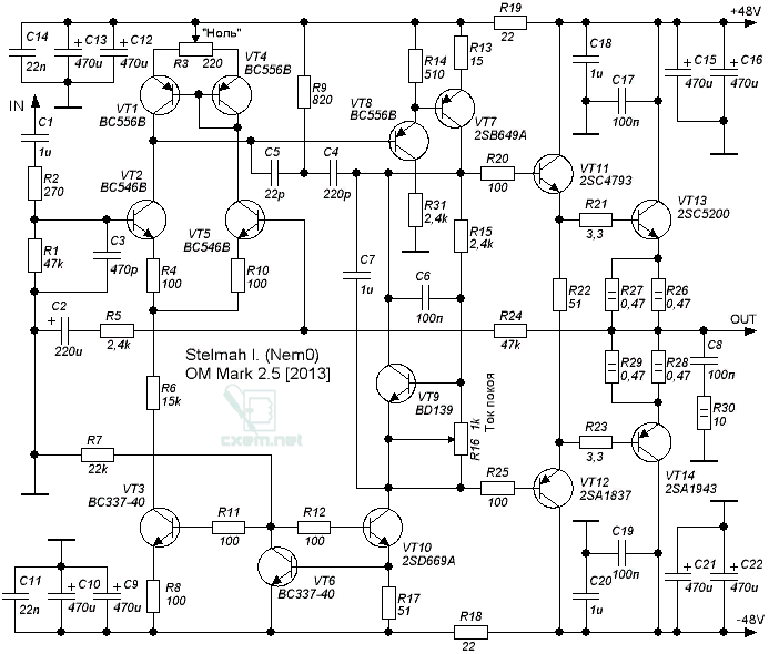 Сразу скажу, я этот усилитель не собирал, поэтому буду говорить об очевидных ошибках. Первое, что бросается в глаза-резистор R 6. Автор его увеличил для уменьшения нелинейных искажений и ,тем самым, вывел из режима транзисторы 3,6,10. Это получилось из-за того,что эмиттерный переход VT 3 стал шунтировать транзисторы 6,10. Устранить это можно путём увеличения резистора 8 до 200 Ом (или подобрать его так, чтобы ноль на выходе устанавливался в среднем положении резистора 3), а резистор 6 значительно уменьшить до 4,7 кОм. А теперь будем бороться с искажениями, с которыми боролся автор, увеличивая R 6. Источник искажений -нестабильное опорное напряжение, которое было взято с коллектора VT 6. Для устранения пульсаций нужно увеличить R 11 до 1...2 кОм и включить электролитический конденсатор , ёмкостью 50...100 мкФ, между базой VT 3 и эмиттером VT 6, плюсом к базе VT 3. А для тех, кто собирается повторить этот усилитель, я посоветую заменить источник тока и сделать его так как сделано в ОМ 2.7. Возможно после этого усилитель заработает с возбуждением, тогда нужно подбирать коррекцию У величить резистор 9 до 2,2 кОм, конденсатор 5-до 180 пФ. Хорошие результаты даёт подключение конденсатора 100пФ между базой и коллектором транзистора 10. Автору этого усилителя, на его сайте, задавали вопрос о несоответствии заявленных и реальных нелинейных искажениях. Я не нашёл ответа. Я, думаю, надо скептически относиться к заявленным параметрам у некоторых авторов. Также задавали вопрос о возбуждении усилителя при изменении номиналов делителя ООС. Также не было ответа. О том , как влияют эти резисторы на устойчивость усилителя, Вы можете узнать из видео на моём Ютуб-канале " Берилл 73 "-"Теория устойчивости УМЗЧ". В усилителе ОМ 2.5, также была уменьшена величина резистора 2, после чего RC-цепочка на входе "требует " низкоомного выхода источника сигнала, например для наушников. Резистор 2 надо увеличить. Частоту среза этой цепочки можно будет подсчитать по формуле: частота в кГц = 159/(RC) . Сопротивление 2 в кОм, ёмкость С 3- в нанофарадах. Автору ОМ 2.5 задавали вопрос о внедрении защиты от короткого замыкания на выходе, на что он не возражал. Но если вставить защиту , как это сделано в ОМ 2.7, то надо будет вводить ограничение тока через транзисторы VT 7,8 в момент короткого замыкания. Если кому будет интересно как это сделать-пишите в комментариях. Постараюсь ответить на Ютубе- канал " Берилл 73 ". Будут ещё вопросы-пишите.