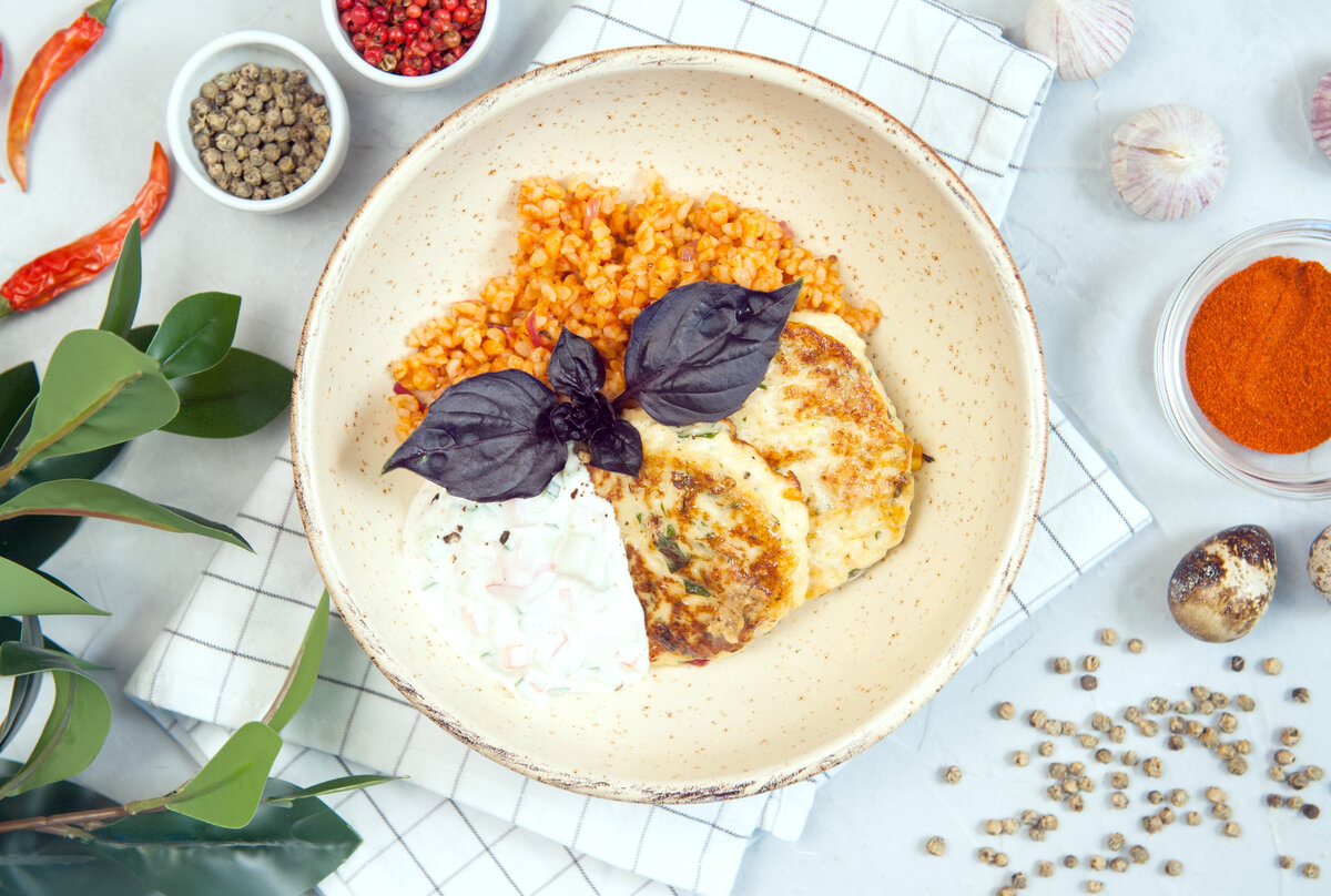 9. Подаём котлеты с булгуром и соусом, украшаем базиликом и перцем. Приятного аппетита!