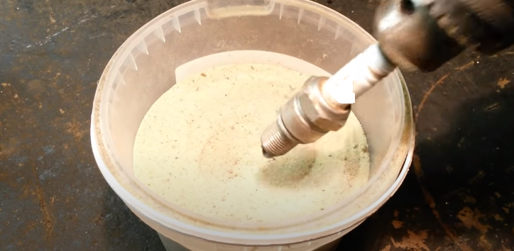 1. Если свечи загажены не очень сильно, то можно попробовать следующий способ. Насыпаем в баночку обычного песка. Берем дрель и вставляем в нее свечу зажигания.