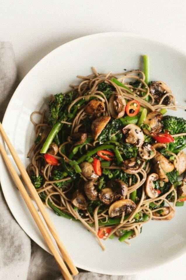 5. Выкладываем лапшу на тарелки, сверху кладем грибы, посыпаем кунжутом, острым перцем и зелёным луком.