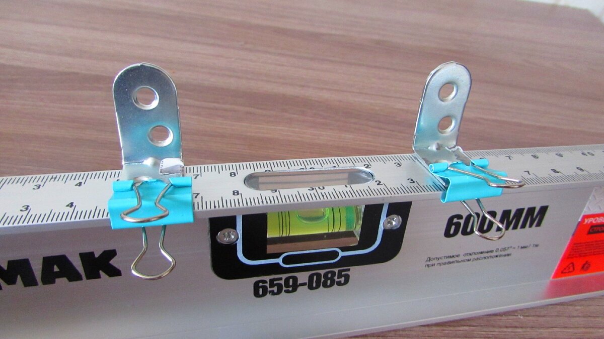 Вот я и встретил человека с перфоратором и уровнем в руках. Вот на уровень я и обратил внимание. Стало любопытно для чего на нём были зацеплены зажимами два уголка. Выглядит это вот так: