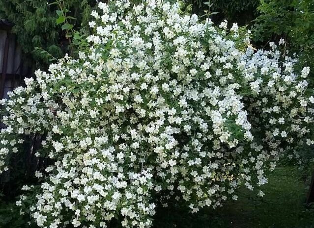 Сорт Mont Вlаn также отличается устойчивостью и обильным цветением – его украшают белоснежные цветки изысканной махровой формы, обильно распускающиеся по всей длине прошлогодних побегов. Куст до двух метров в высоту.