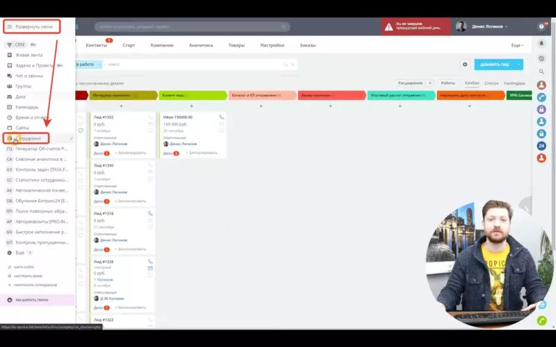 Войдем от имени администратора портала главное левое меню столбик портала. Откроем вкладку «сотрудники».