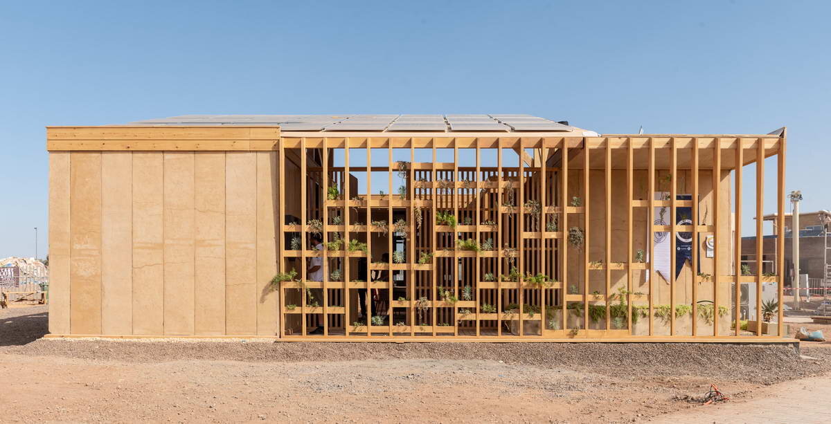Стены сепаратора спроектированы так, чтобы позволить ветру, проходящему через двор, охлаждать температуру, а при ограничении визуального контакта снаружи фасады дома с юга и запада не имеют прозрачных элементов. Солнечные панели дома наклонены под углом 15 градусов поверх деревянного навеса для максимальной эффективности. Этот навес защищает двор от солнца и обеспечивает климатический комфорт. Он также улавливает и перенаправляет ветер во двор, где испарение из пруда с водорослями помогает охладить двор и создать собственный микроклимат.