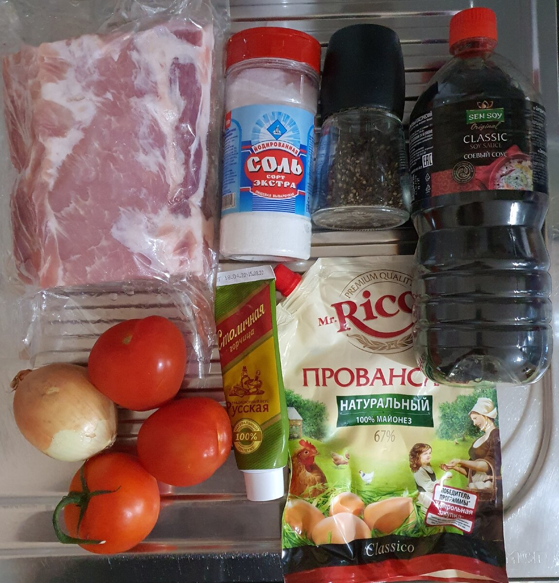 Такой способ приготовления мяса очень удобен и эффектен при подаче. Нежное и сочное мясо, запеченное в фольге потребует от вас минимум энергозатрат и будет украшением любого праздничного застолья. Ингредиенты: - свинина 700 Грамм (корейка без кости) - помидор 2-3 штуки - лук репчатый 1 штука - соевый соус 4 соловые ложки - майонез 3 столовые ложки - горчица 1 столовая ложка - сыр 150 грамм - соль, черный молотый перец по вкусу Мясо нарезаем, но не до конца, на ломтики, толщиной примерно 1,5 см. Смешиваем соевый соус, горчицу и майонез. Хорошо обмазываем этой смесью мясо, при необходимости добавляем соль и перец. Я использую только перец, соли мне достаточно из майонеза и соевого соуса. Оставляем мясо мариноваться на 30 минут при комнатной температуре. Нарезаем ломтиками помидоры. Нарезаем ломтиками сыр. Лук нарезаем полукольцами. Между каждым ломтиком мяса вкладываем ломтики помидора,лука и сыра. Фольгу складываем в несколько слоев, смазываем растительным маслом и в