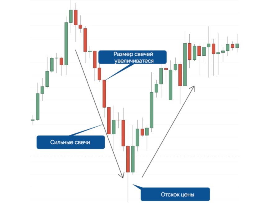 - Затем внезапно мы видим сильную медвежью свечу, которая подтверждает новый нисходящий тренд.