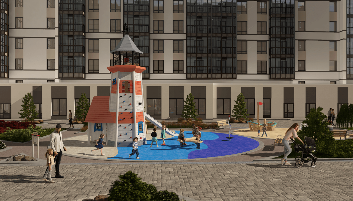 Для детей на территории комплекса установлены импортные тематические площадки для игр в морской тематике, для взрослых выделены зоны для спорта и отдыха, есть беговая дорожка. По периметру во дворе установлено видеонаблюдение.