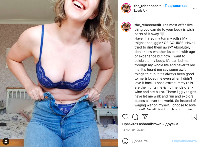 После того, как Ребекка Бурнэтт выпустила серию постов о разнице в размерах, многие блогеры, пишущие о бодипозитиве, поддержали девушку и поделились своими историями о поисках идеально сидящих вещей. Фолловеры Бекки также начали сравнивать джинсы разных размеров с другими брендами, показывая, что стандартов, на самом деле, не существует, а размеры – это всего лишь придумка модной индустрии, которая не очень-то упрощает жизнь.