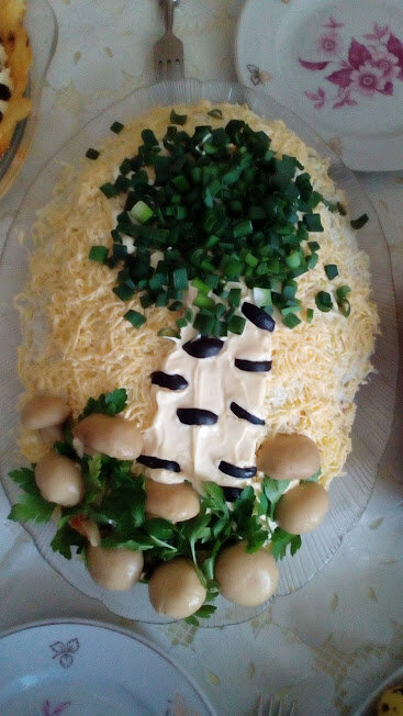 Украшение любого салата тоже можно считать искусством. Не так сложно сделать это красиво, со вкусом. Этот салат я украсила изображением березы.