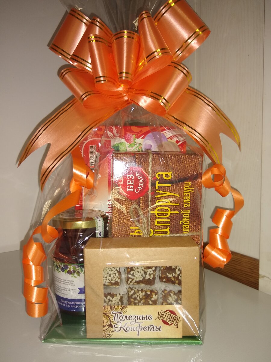 Состоит он из 4-х компонентов. На первом плане мы видим Полезные конфеты без сахара от компании Русские традиции. Данные конфеты примечательны и необычны тем, что изготавливаются из орехов, злаков и сухофруктов. Никаких посторонних добавок, а значит их можно давать детям. Дальше мы видим баночку с джемом без сахара от этой же компании. Посмотрев состав также не увидел никакой химии. В качестве подсластителя используются стевия и фруктоза. Стевия это трава, а фруктоза природный заменитель сахара. Еще дальше видно большую коробку с цукатами грейпфрута в шоколадной глазури. Тоже без сахара. Честно говоря, такое ни разу не пробовал. Дочь говорит, что это очень вкусные "конфеты". Спорить с ней не буду. Их состав такой: кожура грейпфрута, фруктоза, заменитель какао-масла, сыворотка молочная, какао-масло, какао-порошок, лецитин, лимонная кислота и ваниль. Остается открытым вопрос: Почему производитель если есть какао-масло, то добавил еще его заменитель? На один грамм натурального 10 заменителя?