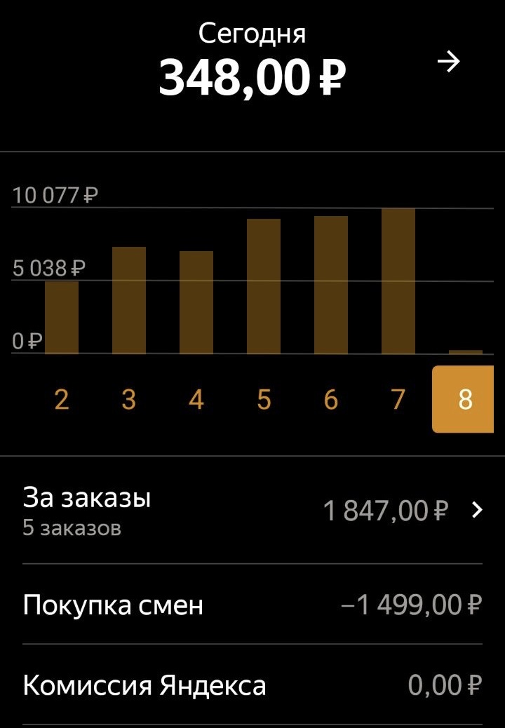 Сегодня я работал, по другой схеме. Купил смену за 1499₽. Включил мой район по 30 минут. Первый 30 минут, мне удалось сделать три коротких заказов. А остальные три по 30 минут по два заказа. Но мне, удалось отбить смену, за 1:20. Это рекорд.