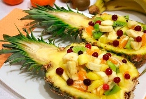 4. Выложить готовый фруктовый салат в половинки ананаса.Украсить зернышками граната. Приятного аппетита!