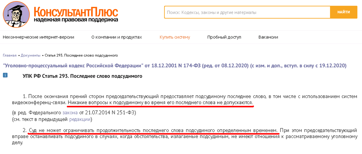 Точнее Уголовно-процессуальному кодексу. А ещё точнее самой этой статье о последнем слове из УПК России.