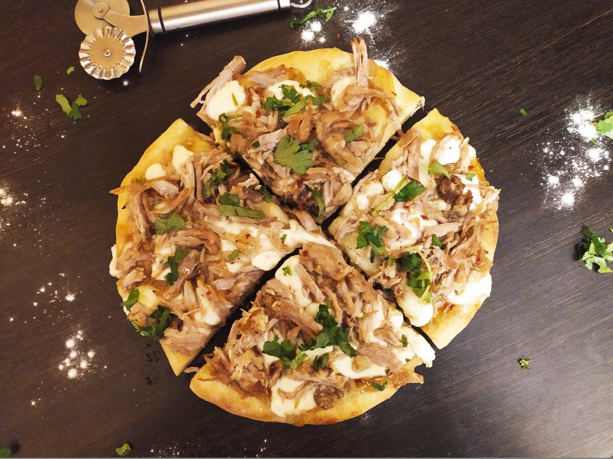 Выпекаем при температуре 250C, на камне для пиццы, 5 минут. Достаем из духовку, выкладываем соус чили, порваную моцареллу, рваную свинину и сбрызгиваем сверху небольшим количеством соуса.