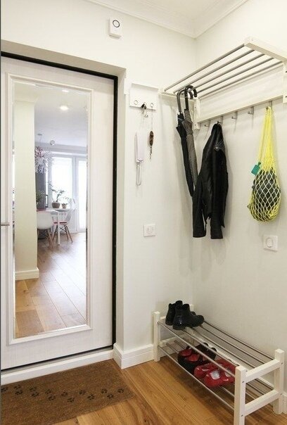 Наверху повесили телевизор, а над ним разместили несколько открытых полок. Обратите внимание, как оригинально хозяева поступили с гладильной доской. Зеркало смещается в сторону и оттуда на механизме опускается доска. При необходимости её можно достать или убрать, а места в квартире она не занимает.
