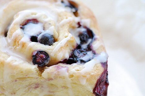 3. Подошедшее тесто выложить на стол, присыпанный мукой, раскатать в пласт толщиной около 10 мм. Смазать растопленным сливочным маслом, посыпать оставшимся сахаром. Распределить чернику по всей поверхности теста, затем вдавить ягоды скалкой.Скатать в рулет, затем нарезать кусками толщиной около 2 см. Перевернуть, расплющить немного рукой и сложить на смазанный маслом противень так, чтобы они дотрагивались друг до друга. Накрыть полотенцем и дать подойти минут 20.