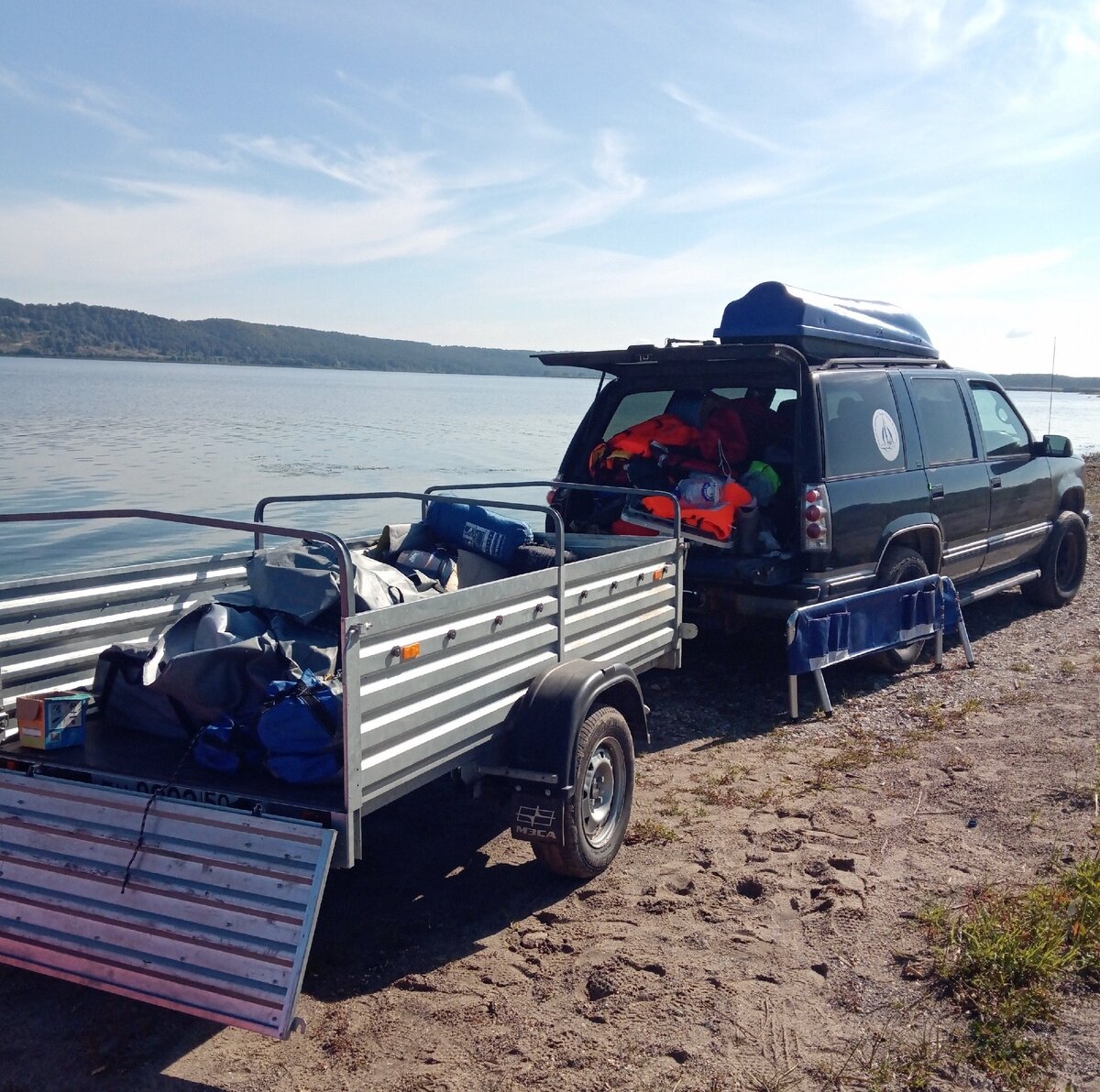 Поскольку полоска берега, где стояла наша палатка, была узкой, а дорога шла прямо к воде. Я предусмотрительно положил посреди дороги бревно. И не зря… Когда совсем стемнело, послышался звук мотора. С холма, в звуках разрывающейся магнитолы слетела Нива и замерла перед уложенным бревном 🚙. Два мужика вышли из авто, сдвинули бревно, молча обошли вокруг нашего костра, у которого сидели я с Наташей (дети были в палатке), бросили взгляд на катамаран, так же молча сели в машину и выкатились прямо на берег. Авто встало в 20 метрах от нас, из него помимо первых двух, вышли еще четверо, из них две женщины, и вся компания разместилась на маленькой полянке рядом с машиной. Гости, молча, с видом хозяев, собрали вокруг нашего лагеря дрова, разожгли костер и накрыли стол. Из динамиков полились песни СССР , от костра потянуло жареным мясом, часто зазвенели стаканы 🍾.