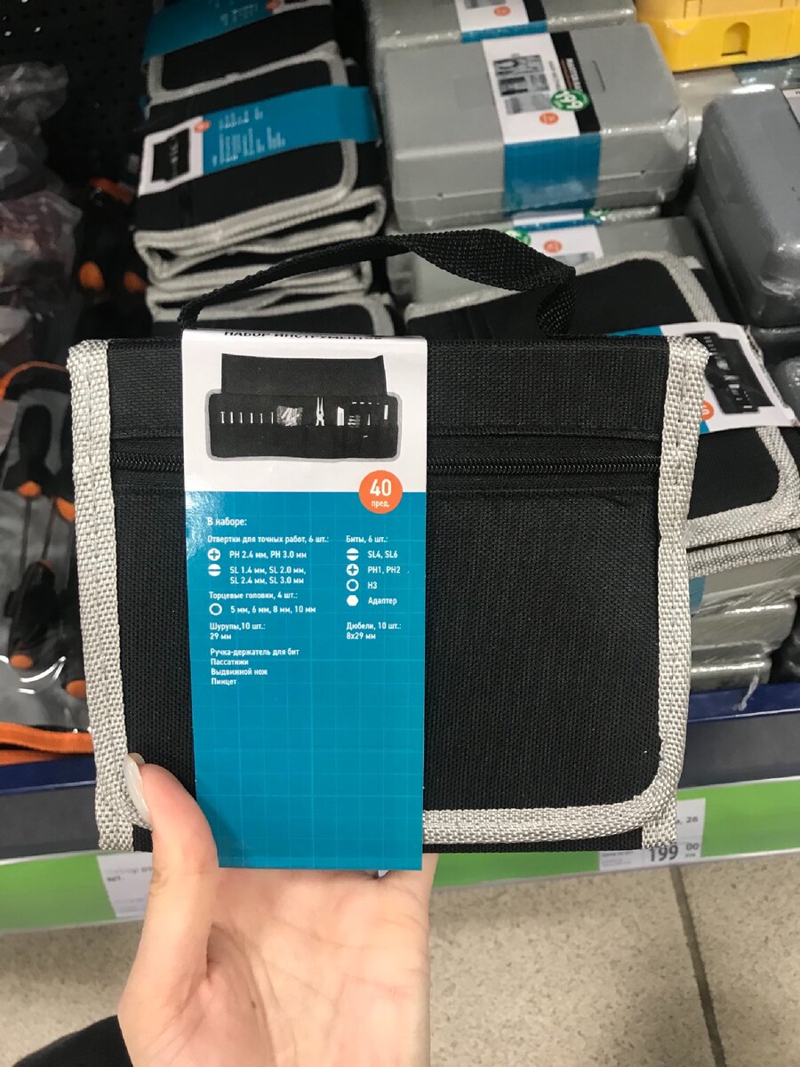 - Этот набор на 40 предметов. В наборе: отвертки для точных работ 6 штук, биты 6 штук, дюбели 10 штук, шурупы 10 штук, торцевые головки 4 штуки, ручка-держатель для бит, пассатижи, выдвижной нож, пинцет. Отличный набор за 199 рублей.