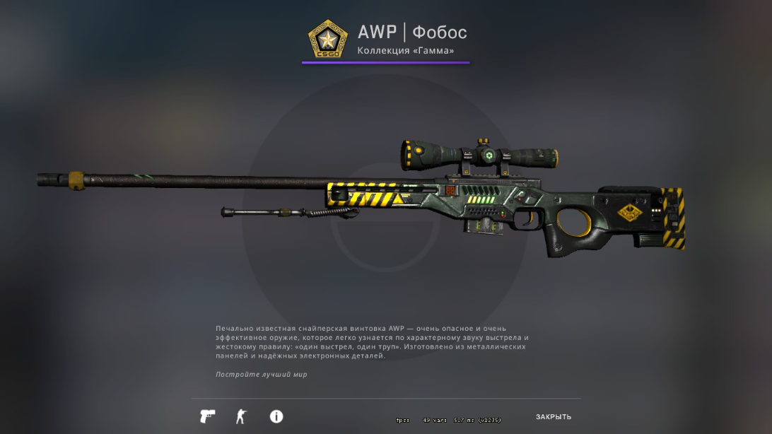 История появления AWP | Фобос (AWP | Phobos) появился в мастерской 27 мая 2016 года и был добавлен в игру 15 июня 2016 года в составе коллекции «Гамма», вышедшей в рамках обновления Gamma Exposure. Автором скина является Apel Стоимость AWP: 157,85 руб.