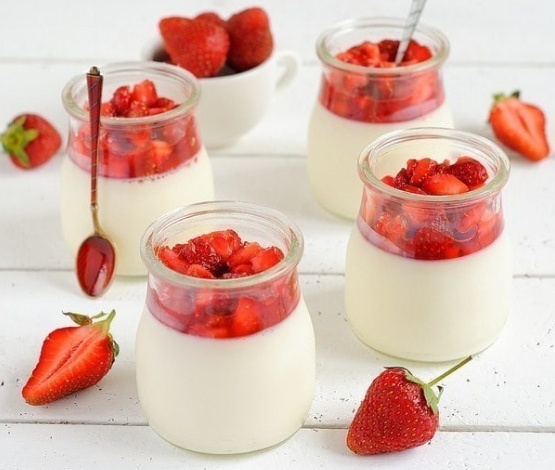 Клубнику порезать маленькими кубиками, выложить на застывшую панна котту, верх полить образовавшимся соком.