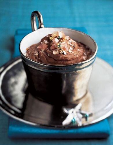 3. Разлить получившуюся массу по креманкам и поставить в холодильник примерно на пару часов. Перед подачей украсить мусс какао-порошком и миндалем.