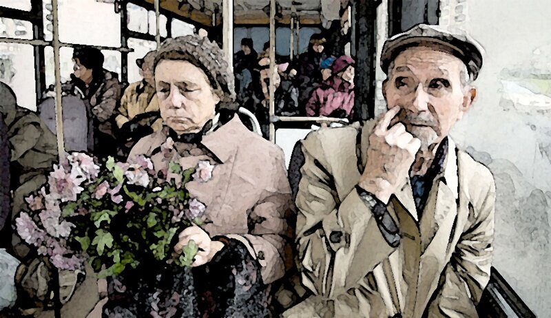 Сидят на сиденьях вместе, им немного за пятьдесят. Девушка с коляской, пытается зайти в автобус, но не может поднять коляску. Мужчина и женщина, друг друга, не знают. Сидят недалеко от средней двери и смотрят на девушку с коляской. Женщина, обращаясь к мужчине, говорит: молодые люди, стоят, и никто не поможет молодой мамаше, молодежь пошла. Мужчина, посмотрев на входящих и выходящих сказал: они с колясками, ходят и курят.