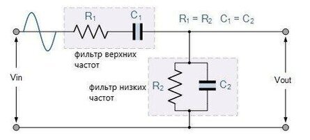 Вышеупомянутая RC — сеть состоит из последовательной RC- цепи, соединенной с параллельной RC, образующей в основном фильтр верхних частот, подключенный к фильтру нижних частот, производящий очень избирательный частотно-зависимый полосовой фильтр второго порядка с высокой добротностью на выбранной частоте ƒr .