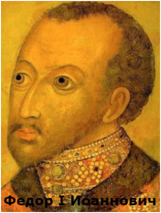 После смерти Ивана IV царский и великокняжеский престол унаследовал его сын Федор Иванович. Старший сын Ивана IV Иван Иванович, бывший первоначально наследником престола, умер в 1581 г. Хотя было заявлено, что старший царевич, всюду и везде сопровождавший своего отца, умер от болезни, ходили упорные слухи, что легко впадающий в ярость грозный царь в ссоре ударил сына в голову жезлом, и от этой раны Иван Иванович и умер. Доказательств этим слухам, хотя и очень стойким, однако, и поныне нет. Федор Иванович был полной противоположностью своему наводившему на всех ужас отцу. Единственное, чему он посвящал свою жизнь, была религия. Вставая около четырех часов утра, он усердно молился, затем здоровался с женой и вместе с ней отправлялся в церковь. После утренней молитвы он принимал установленные придворным распорядком чествования от бояр и снова шел в церковь на обедню. Возвратясь из церкви, он обедал, спал, а затем шел в церковь на вечернюю молитву. Каждую неделю царь посещал какой-либо мо