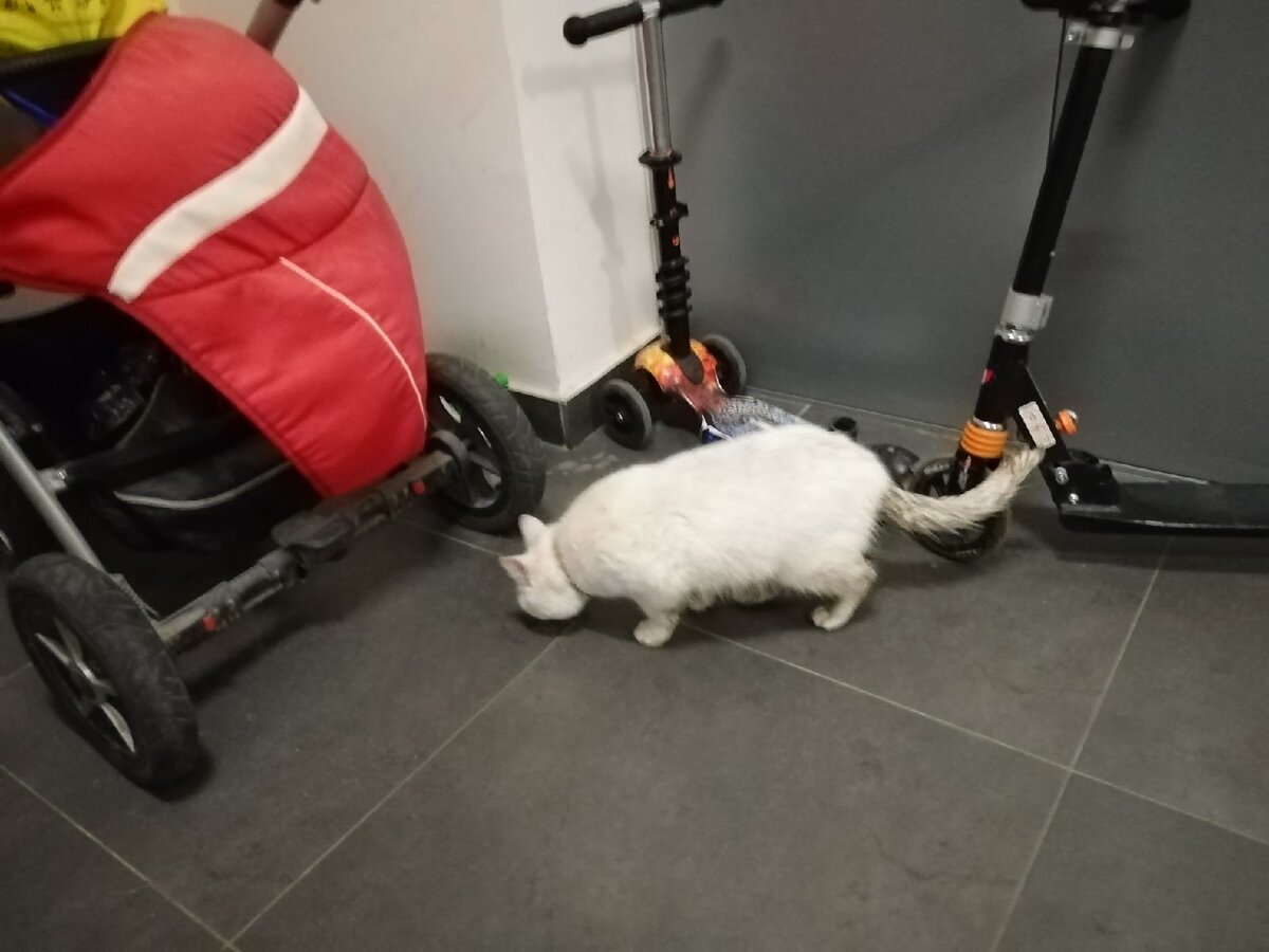 В январе 2021 года, возвращаясь домой, застали неожиданную картину. В тамбуре сидел совершенно белый кот. На коробку мы вообще сперва внимания не обратили. Кот курлыкал и вёл себя достаточно спокойно, даже рад был нашей с ним встрече.