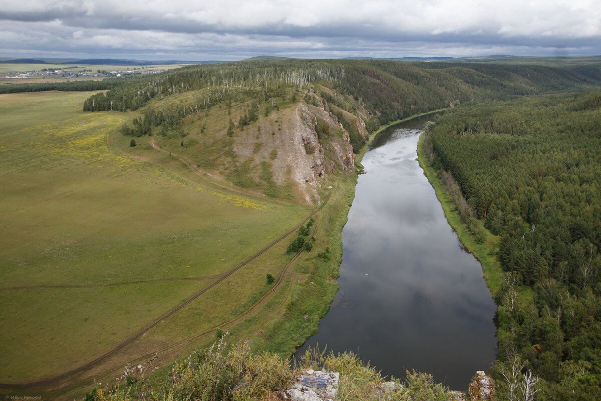 Утро встретило меня низкими облаками и холодом. Надо было что то делать со вчерашними потерями и в первую очередь нужна нормальная стоянка с дровами, чтобы развести костер и просушится. Дождя ночью не было, дорога по вчерашним холмам просохла и совершенно без проблем выехал обратно на асфальт. Плотно позавтракав в придорожном кафе поехал искать новую стоянку. Нашел нормальное место около села Лаклы на реке Ай на самой вершине скалы)