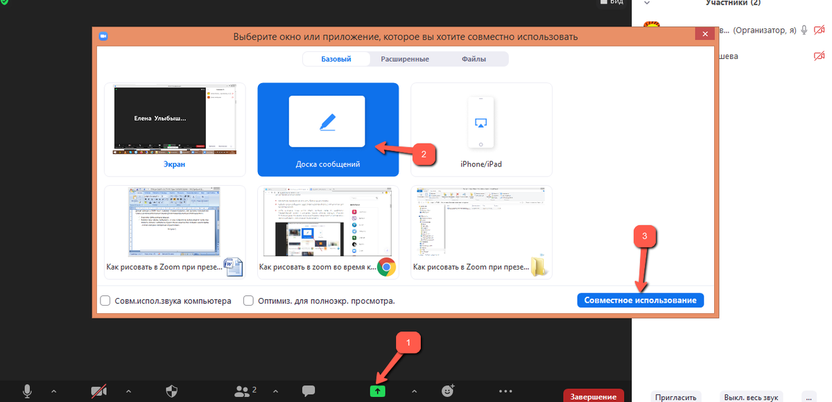 - Выбрать окно «Доска сообщений», и ниже «Совместное использование» после чего появится область с набором инструментов для возможности внесения комментариев – и организатором конференции, и участниками.