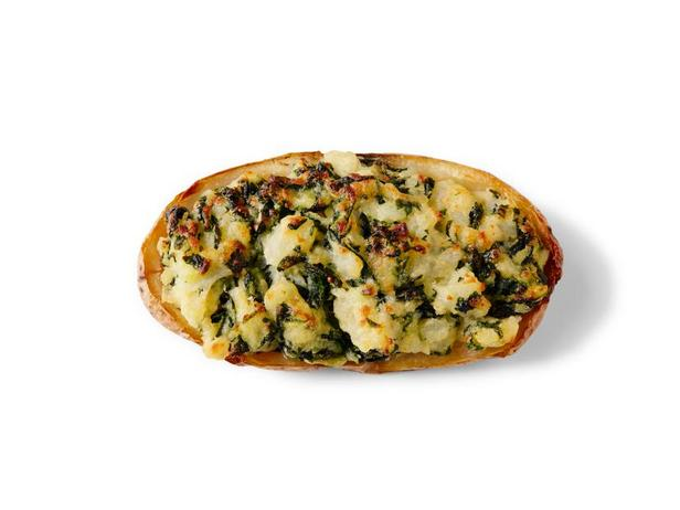 Дважды запечённый картофель можно подавать и как гарнир, и как закуску. В приготовлении используются клубни картофеля рассет весом примерно по 300 граммов, чтобы одной половины хватило на порцию. Сначала картофель запекается целыми клубнями, а второй раз – с начинкой. Для начинки картофельная мякоть смешивается с жареным шпинатом, тёртым пармезаном, пряностями, яичными желтками и взбитыми