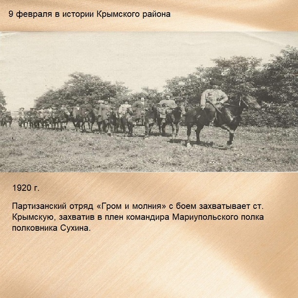 9 февраля 1920 г. Партизанский отряд «Гром и молния» с боем захватывает ст. Крымскую, захватив в плен командира Мариупольского полка полковника Сухина.