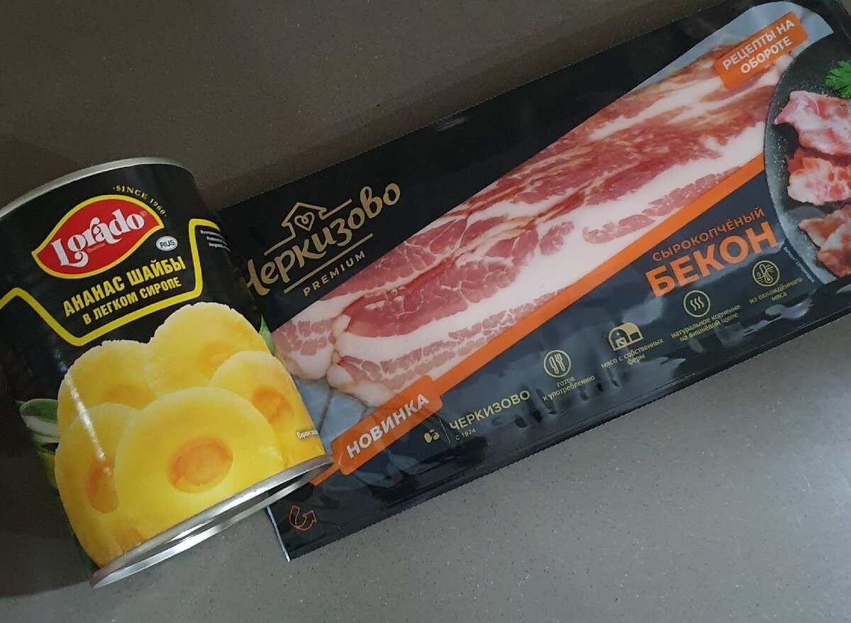 1. Ананасы и бекон режем пополам. Бекон можно не разрезать, а оборачивать полностью, на ваш вкус.
