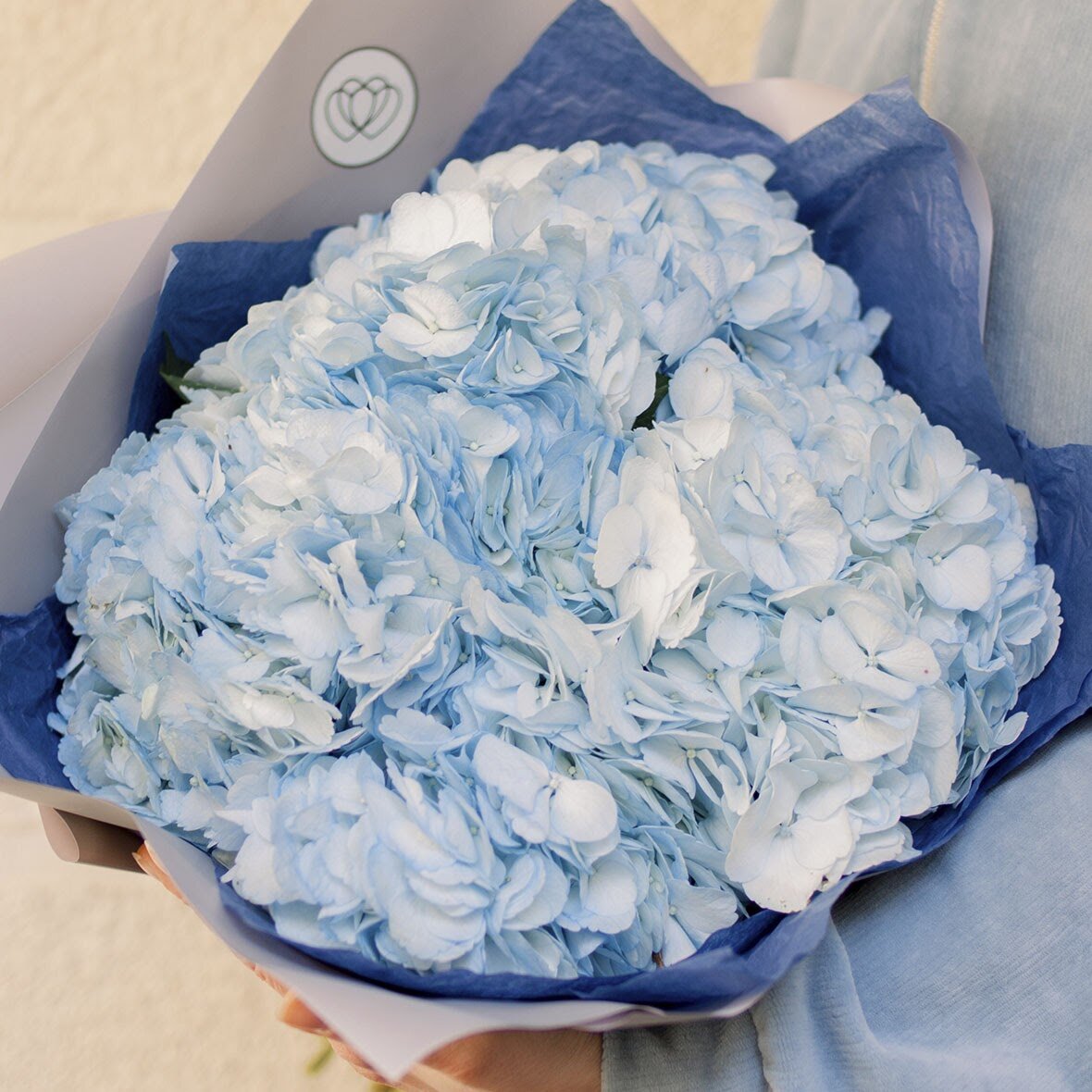 К платью цвета шампанского и цвета слоновой кости также рекомендуем приобрести букет из нежно-голубых гортензий. Он пышный и легкий. В нашем магазине представлены букеты из трех голубых гортензий, из пяти и из семи. Имеем и вариант букета из 5 гортензий в белой шляпной коробке. Согласитесь, есть из чего выбрать!
