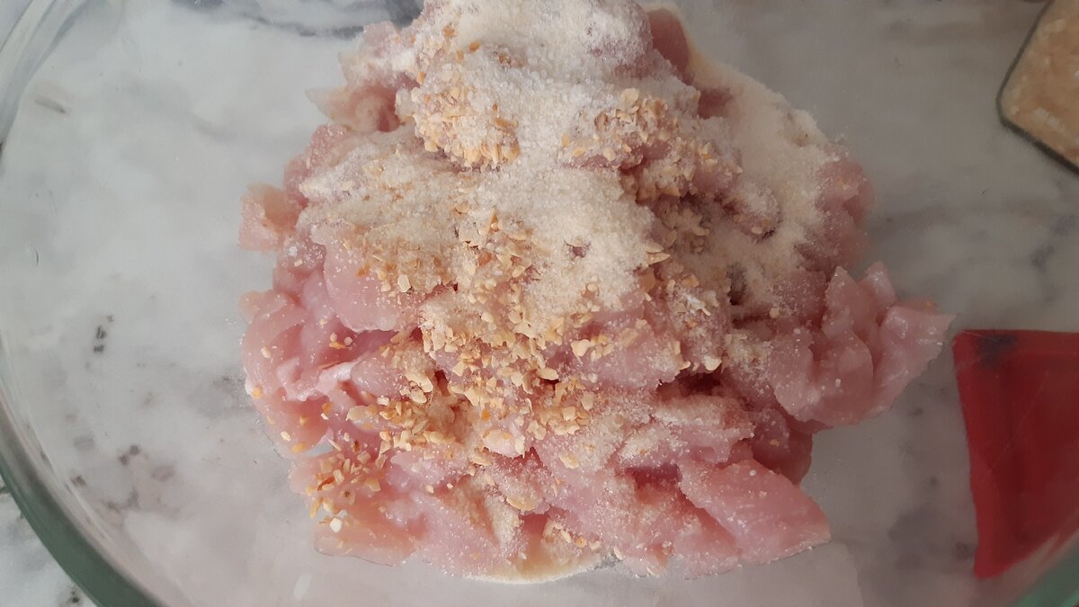 Мясо я порубила очень-очень мелко. Посолила, поперчила, добавила сушеный чеснок, присыпала желатином и перемешала.
