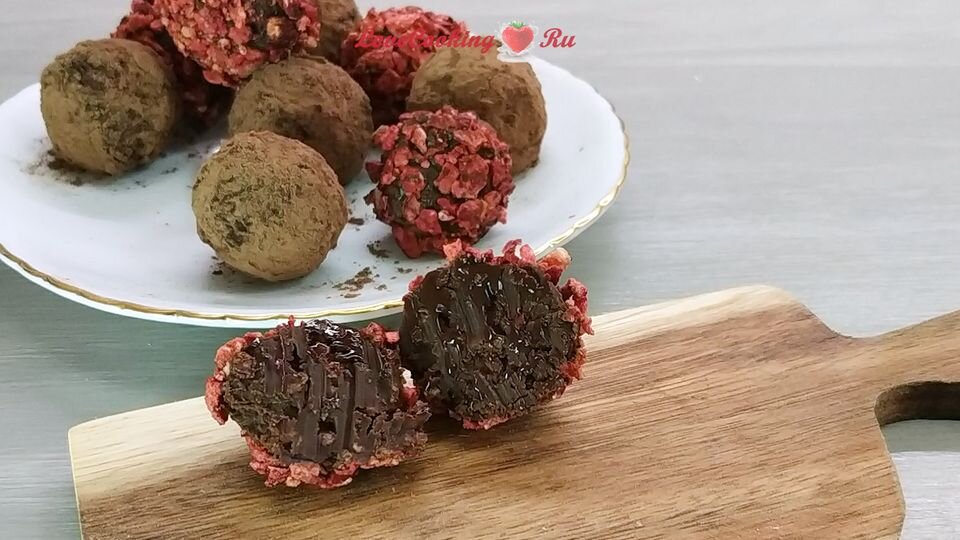Достаем, снова скатываем шарики. Теперь им легче придать форму. Обваливаем в какао-порошке или сублимированных ягодах.