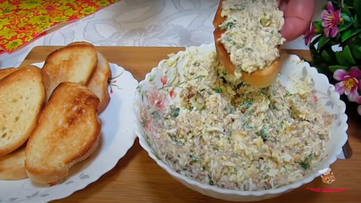 - Все тщательно перемешиваем, и выкладываем ее на кусочки батона.