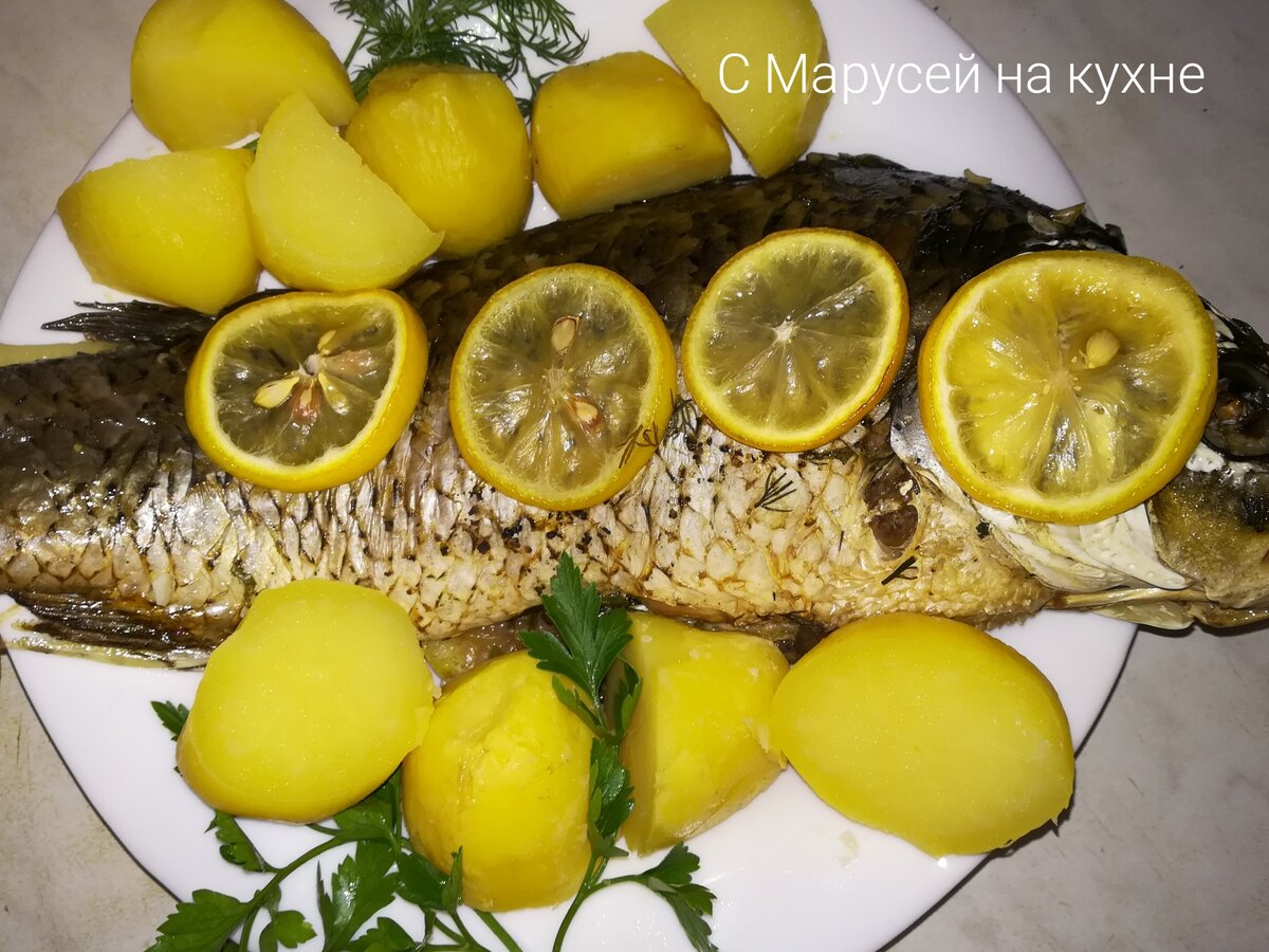 Ставим форму в нагретую духовку, и запекаем рыбу до готовности. Время приготовления напрямую зависит от веса рыбы. У нас сазан весит около 1,5 кг - поэтому мы готовим его 1 час.