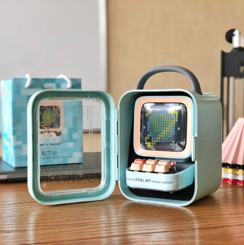 Такой необычный гаджет с Алиэкспресс может понравиться многим. Эта блютуз колонка выполнена в металлическом корпусе, с механическими кнопками и напоминает старый компьютер с дисплеем в стиле пиксель-арт. В гаджете имеются такие функции, как встроенные игры, будильник, блютуз-колонка, секундомер, информер погоды, таймер, оповещатель уведомлений из социальных сетей и т.д.