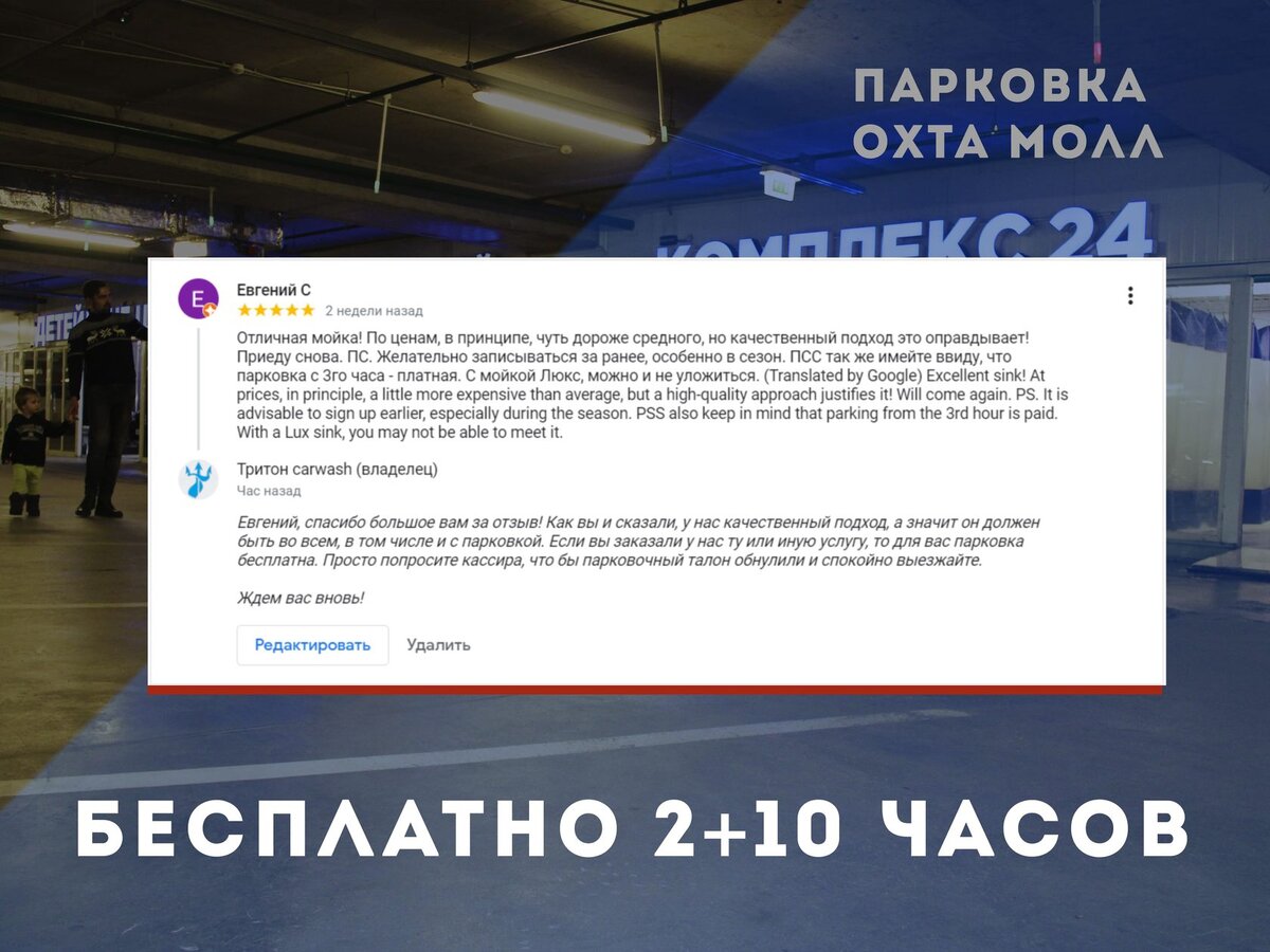 Для Клиентов автомоечного комплекса "Тритон" и детейлинг центра "Зевс" парковка в ТРЦ "Охта Молл" бесплатна!