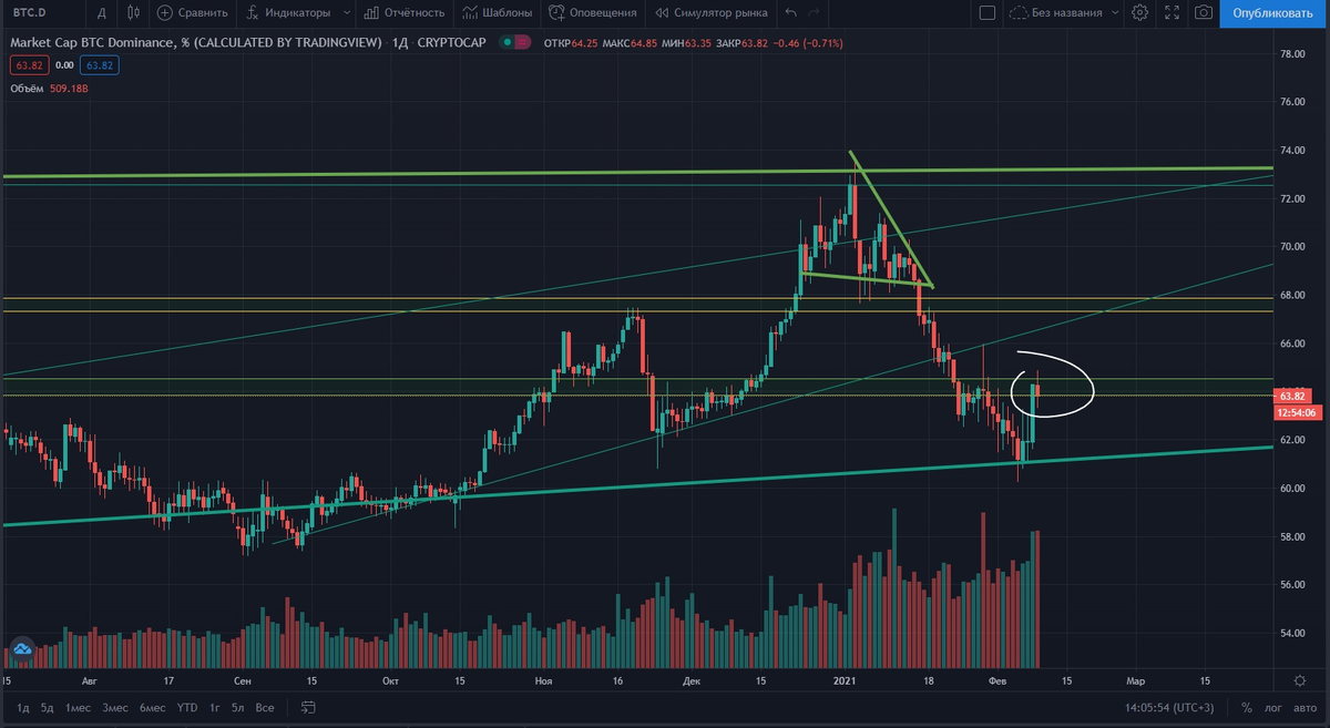 Пробой же поддержки 61-60% позволит начаться очень массивному сезону альткоинов 🔥
