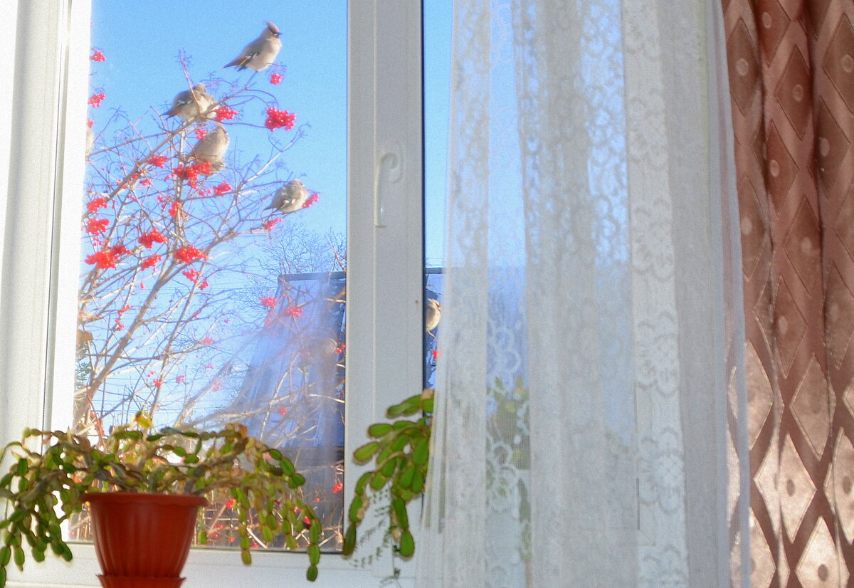Как то раз в начале зимы я проснулась с ощущением того, что за окном происходит что-то необычное. Там раздавались звуки то ли свиста, то ли журчания и их было много, казалось, они заполнили все пространство. Подошла к окну, тихонько выглянула, слегка сдвинув шторку. Ночью выпал свежий снежок, он лежал везде и сверкал на солнце.