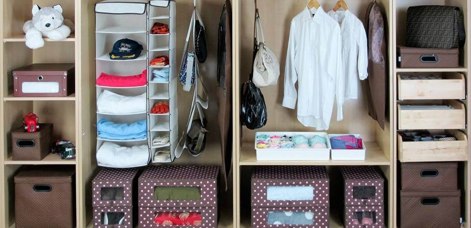 Контейнеры, органайзеры разных размеров для хранения вещей в шкафу или гардеробной. Подойдут и коробки. Достаточно все разложить один раз. Зато потом не придется искать второй носок или нужный ремень.