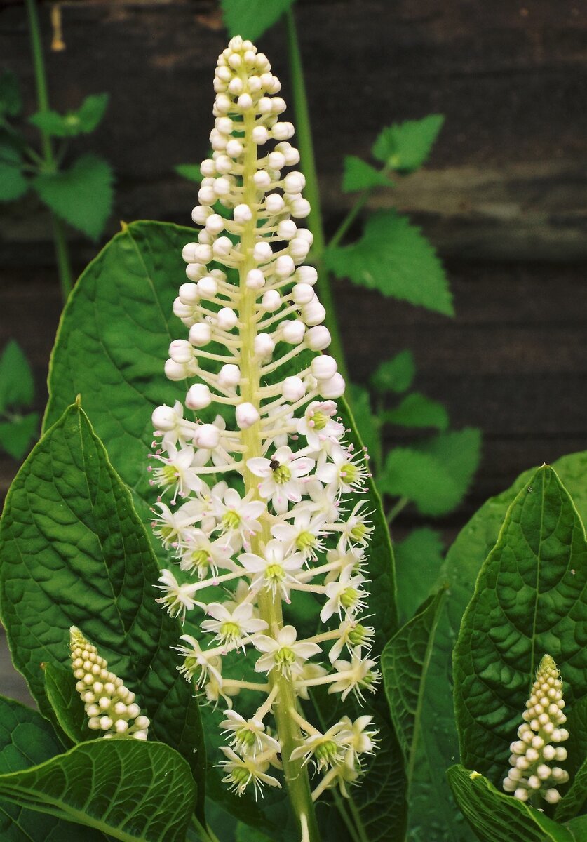 Фитолакка или Лаконос американский - многолетнее травянистое растение высотой в средней полосе России примерно до 1,5 метров, на родине растение может достигать в высоту 3 метра. Фитолакка имеет очень крупный, мощный корень. В средней полосе России зимует без укрытия. Растение хорошо будет расти в полутени, желательно, место защищенное от ветра. Предпочтительно - удобренная почва без застоя воды. Фитолакке необходим своевременный полив. Иногда нужна дополнительная опора. Сажать фитолакку необходимо отдельно от других видов цветочных культур, она их просто загубит. Фитолакка устойчива к болезням и вредителям. Лаконос американский имеет крупные листья и разветвленные побеги. Зацветает фитолакка примерно в середине июля и цветёт по август. Цветочки диаметром меньше 1 см собраны в соцветие длиною до 25 см. Цветы имеют аромат и являются медоносами. После цветения, примерно в середине августа, образуются ягодки лаконоса, которые постепенно приобретают тёмно-тёмно фиолетовый цвет и