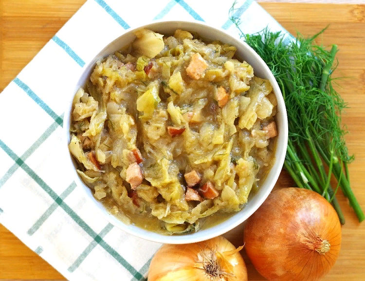 Чуть более содержательная версия тушеной капусты – с добавлением поджаренного лука и сосисок.