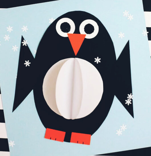 Из цветной бумаги вырезаем необходимые детали: овальное тело, треугольные крылья, лапки, клюв, глаза. Все получившиеся детали склеиваем между собой. Глаза можно дорисовать черным фломастером. Картон можно украсить снежинками, готовую поделку приклеить к фону.