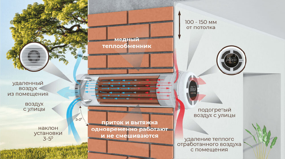 - Вытяжка и приплыв работают одновременно, поэтому потоки воздуха не смешиваются.