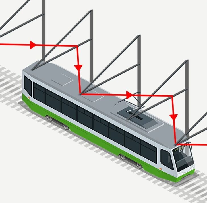 Если присмотреться к трамвайным путям, можно заметить, что контактный провод висит не по прямой, а зигзагом.